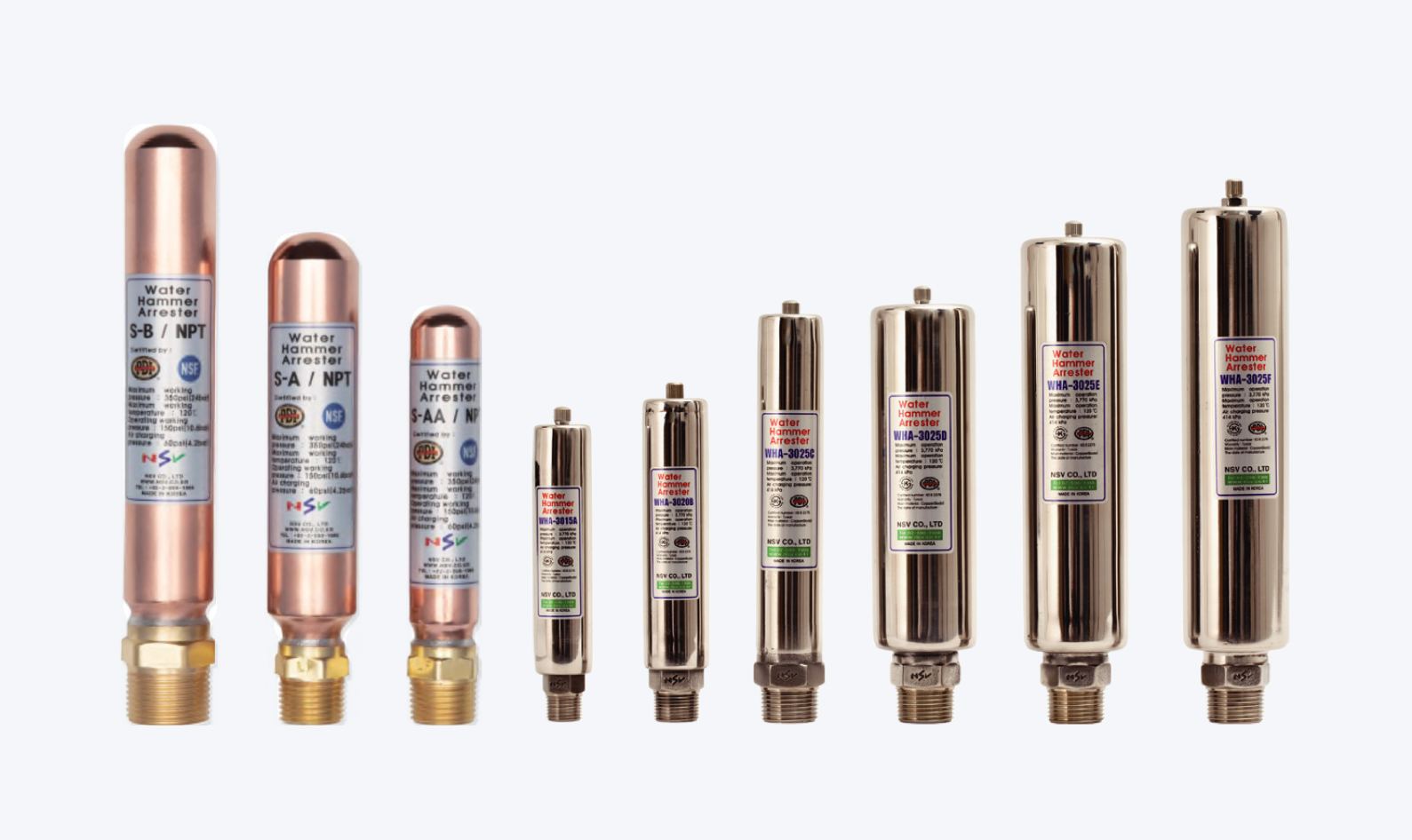 產品介紹 PRODUCT INTRODUCTION WHA 水錘吸收器 承插式接頭 K-Type 承插式接頭 J-Type WHA 水錘吸收器 切管機 首頁 產品介紹 NSV- WHA銅 /NSV- WHA-3000 不銹鋼水錘吸收器 NSV- WHA銅 /NSV- WHA-3000 不銹鋼水錘吸收器 產品特色 所有配件使用無毒材料,符合飲用水標準 有 PDI 認證標準 有 NSF 飲用水認證 採 FDA 核准潤滑油 各型號都經過 20000 次循環測試 可水平、垂直,或任何角度安裝 產品詳細介紹 產品規格 NSV 水錘吸收器 產品規格